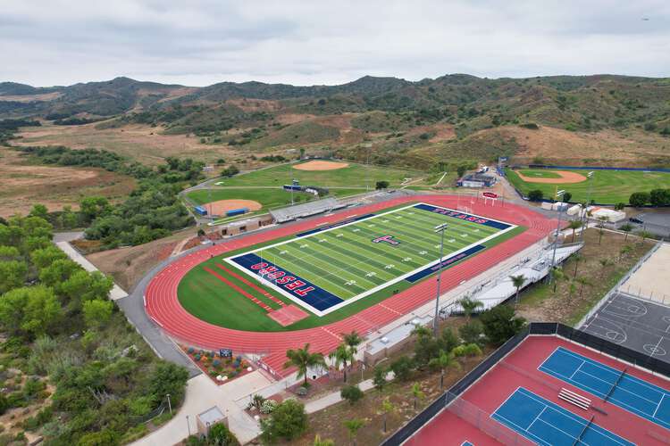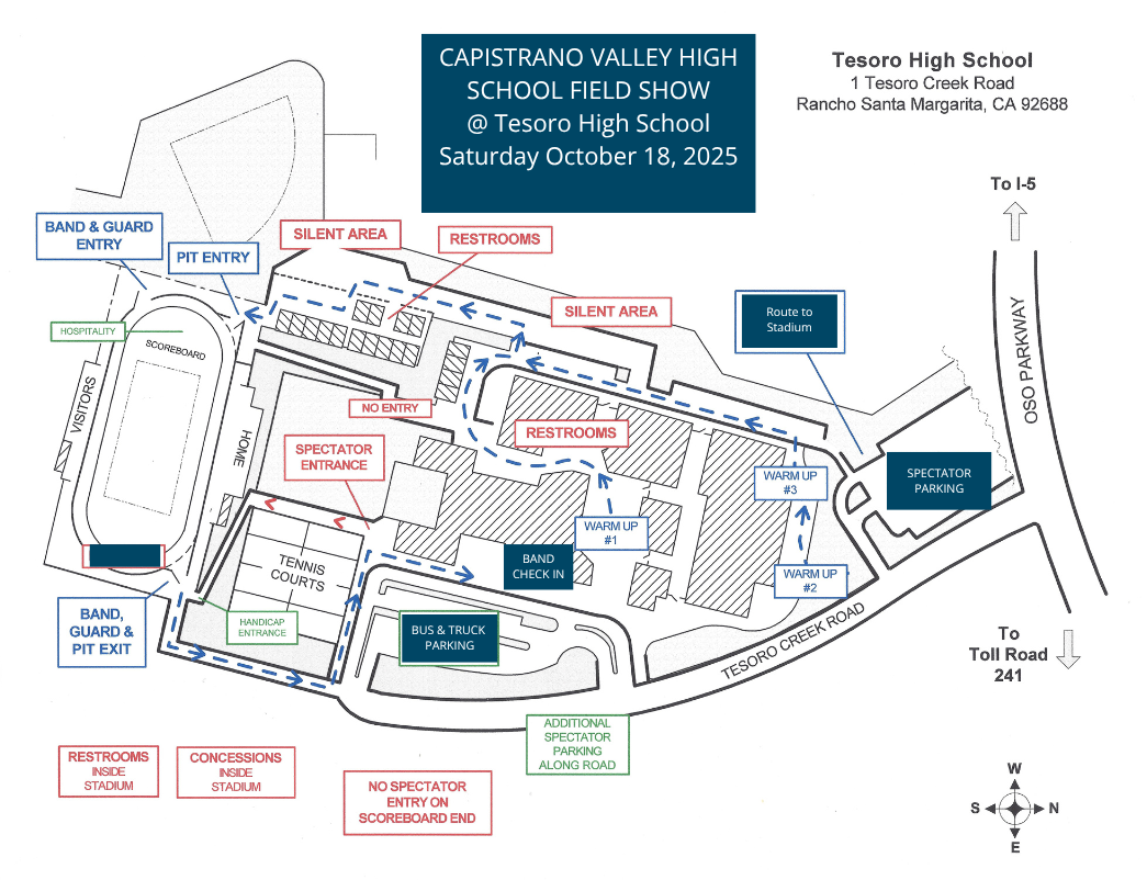 Tesoro High School is located at 1 Tesoro Creek Road, Rancho Santa Margarita, CA 92688. All buses and support vehicles will enter the school from Oso Parkway to Tesoro Creek Road. Enter the second parking lot. This is called the “staff lot” and is closest to the gym.